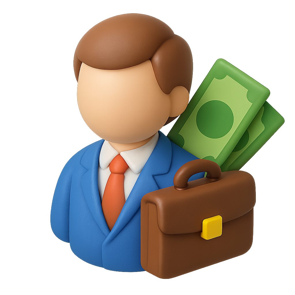/Collection: /by davooda/Type: PNG/A minimalist 3D icon depicting a businessman holding a briefcase and cash, rendered in an isometric style with a transparent background. The character has a smooth finish and vibrant colors.