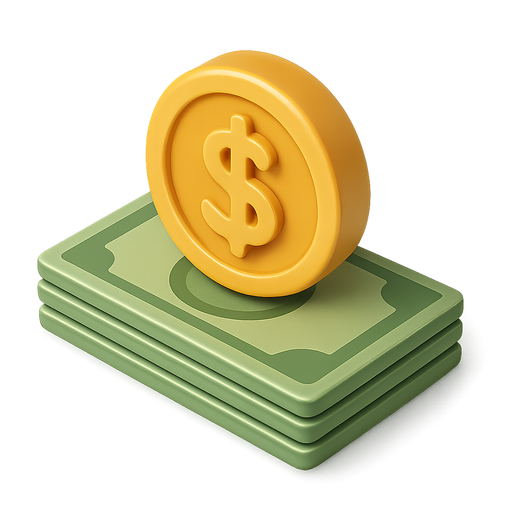 A vibrant 3D representation of a dollar coin resting atop a stack of green bills, featuring a glossy finish and isometric view, set against a soft gradient background.