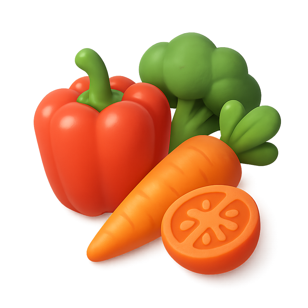 A vibrant 3D icon featuring a bell pepper, carrot, and broccoli in a three-quarter view, showcasing a volumetric and isometric design on a transparent background.