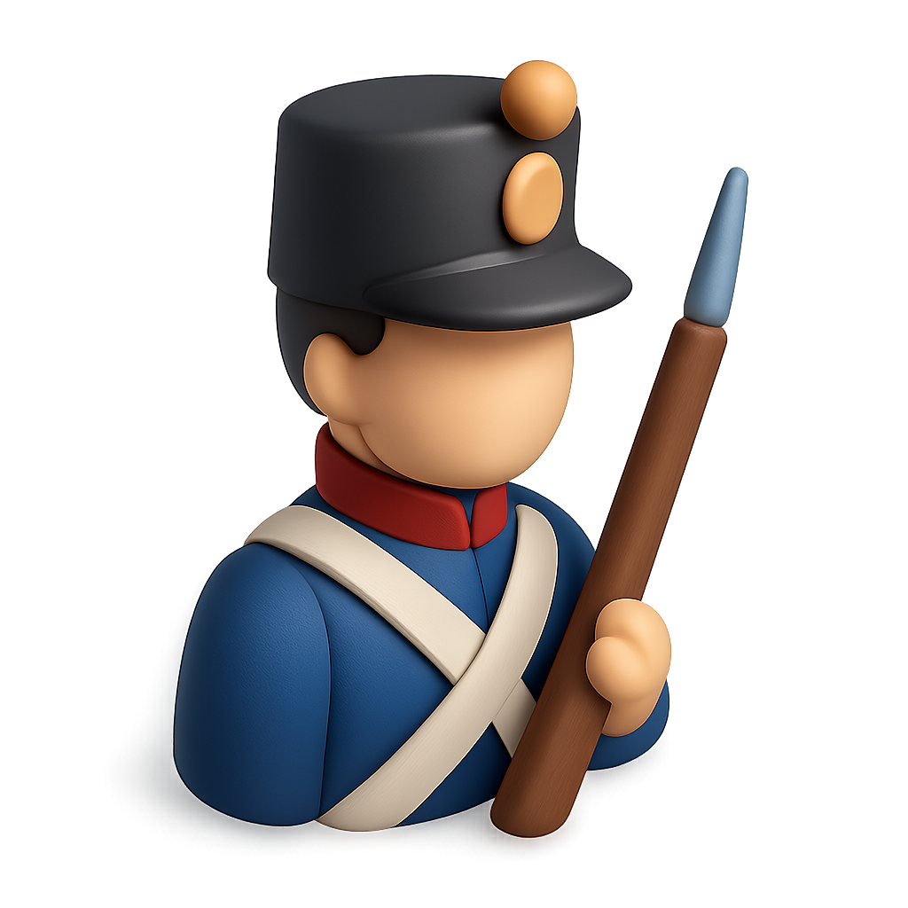 /Collection: /by davooda/Type: PNG/A stylized 3D icon of a fusilier infantry soldier, featuring a three-quarter view. The character is designed with a rounded silhouette, holding a spear, and dressed in traditional military attire.