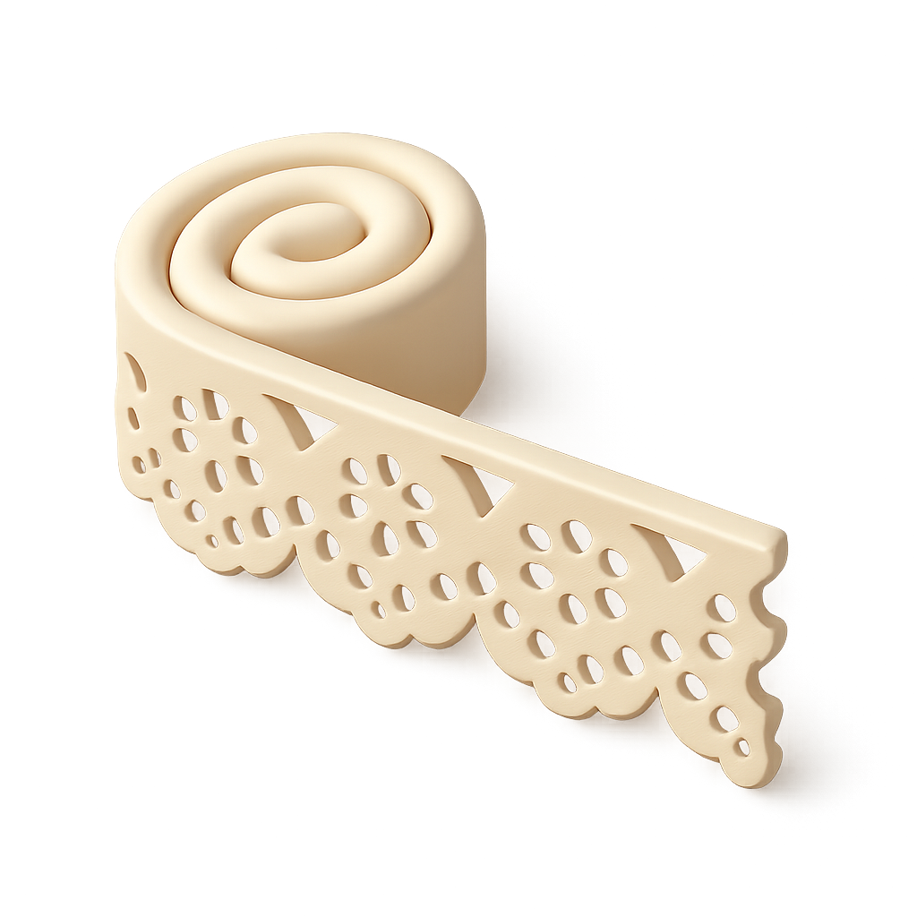 A beautifully crafted 3D icon of a lace trim in a soft cream color. The design features intricate cutouts and a smooth, spiral finish, set against a subtle gradient background.