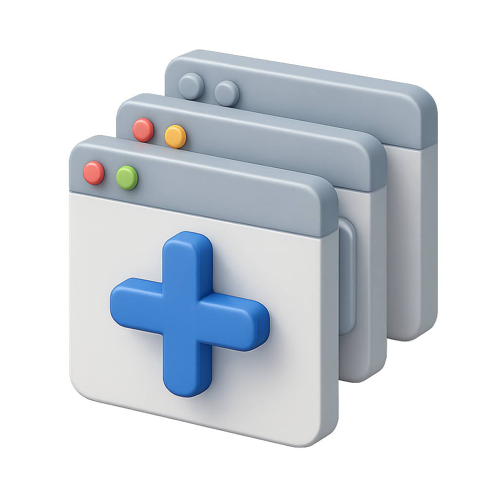 Stylized 3D Overlapping Windows Icon with Plus Sign