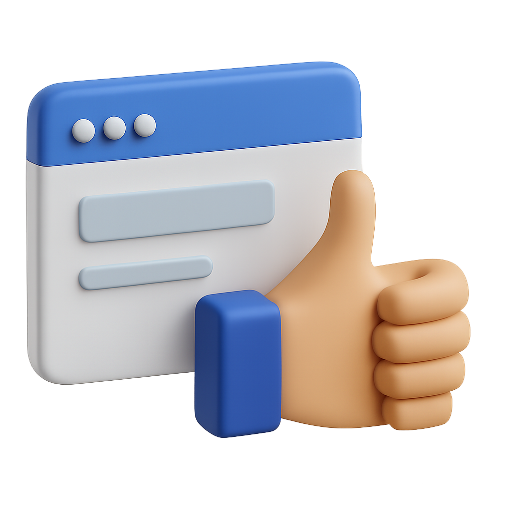 A 3D thumbs-up icon depicted in a three-quarter view, set against a transparent background. The icon features a stylized webpage with a blue and white color scheme.