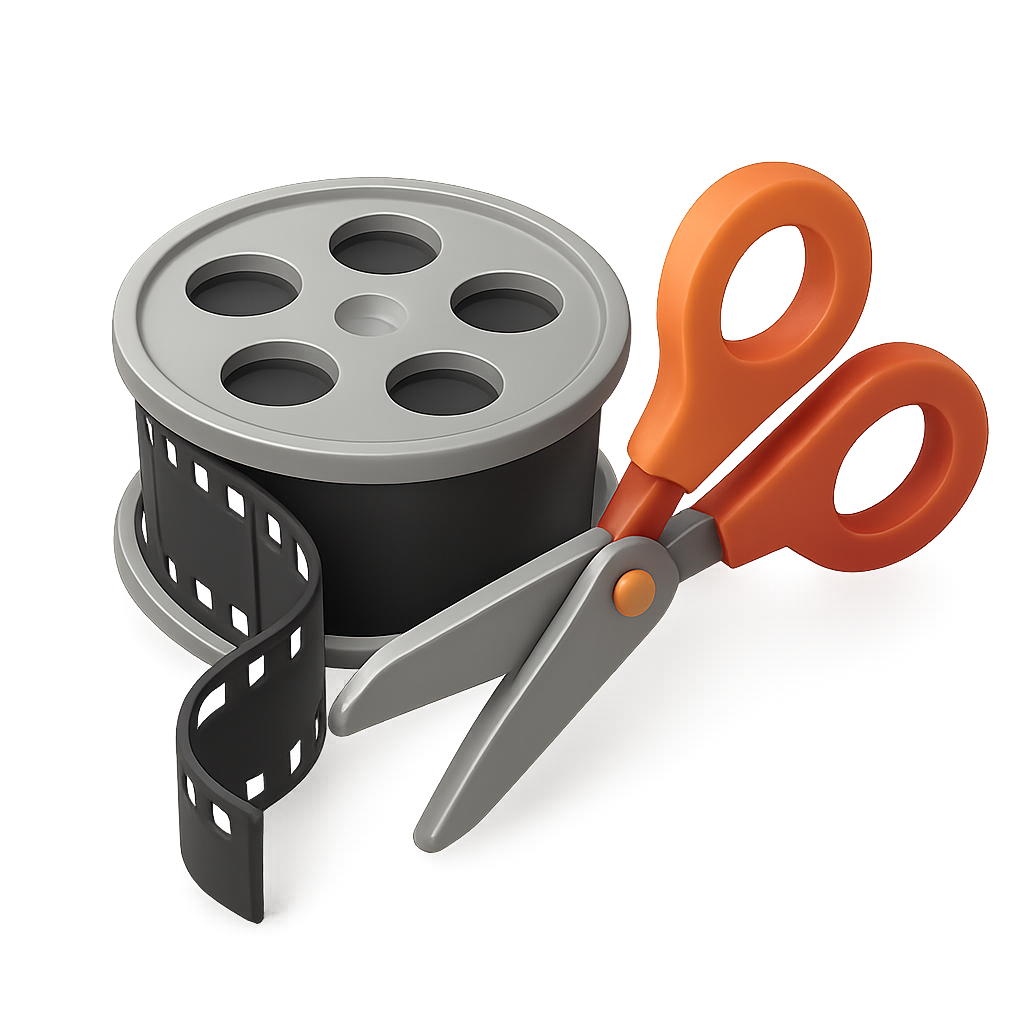 A stylized 3D icon featuring a film reel and scissors, designed in a three-quarter view with a transparent background. The reel displays film strips while the scissors are prominently positioned.