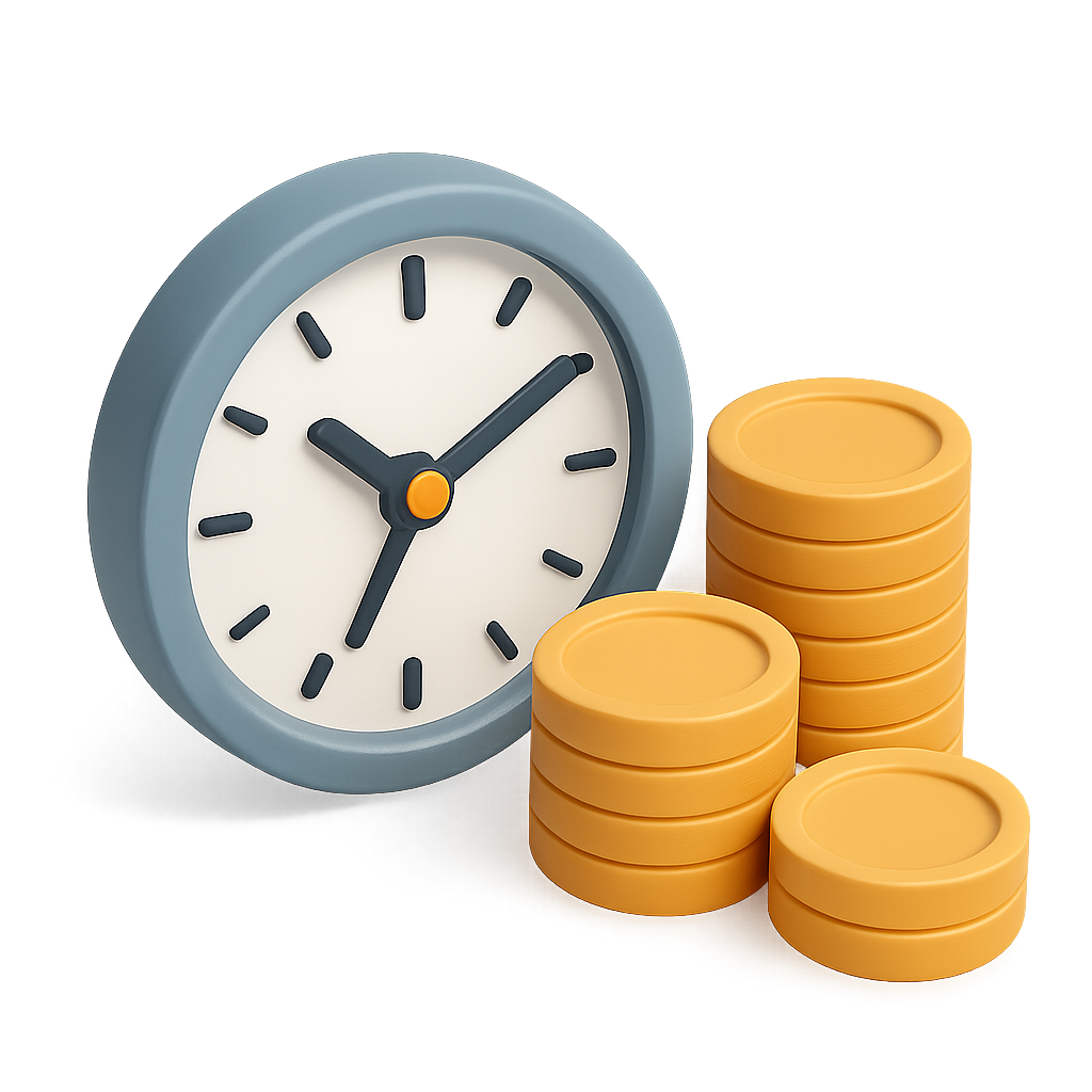 3D Icon of Clock with Stacks of Coins in Isometric View