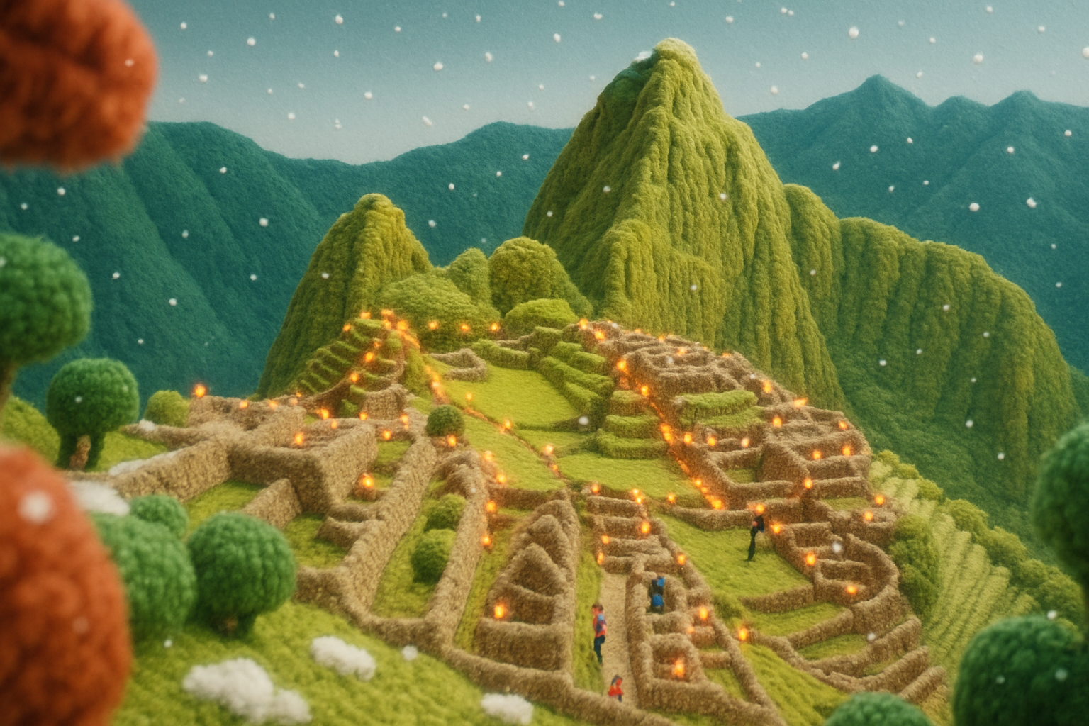 Whimsical Yarn Machu Picchu Scene with Holiday Atmosphere