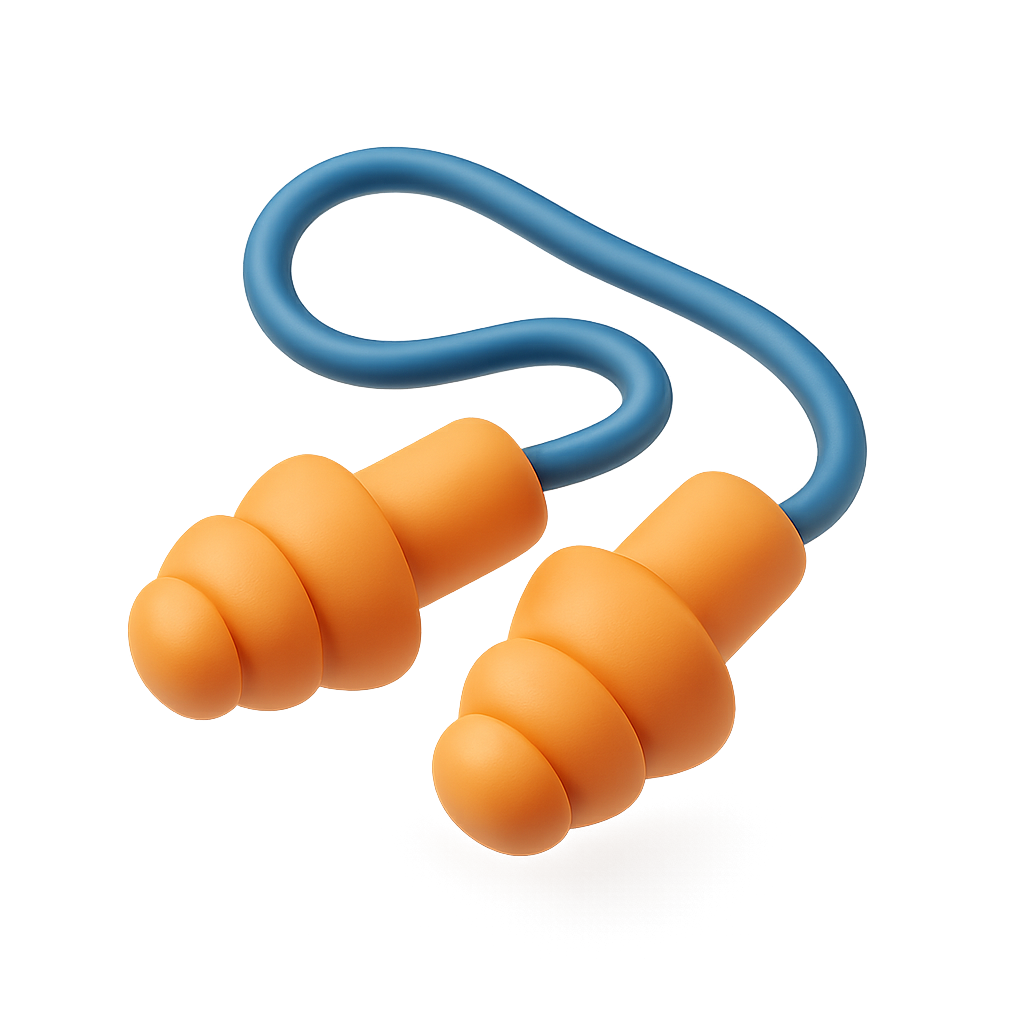 A visually appealing 3D icon of ear plugs designed for noise protection, featuring a vibrant orange color with a blue cord, set against a soft gradient background.