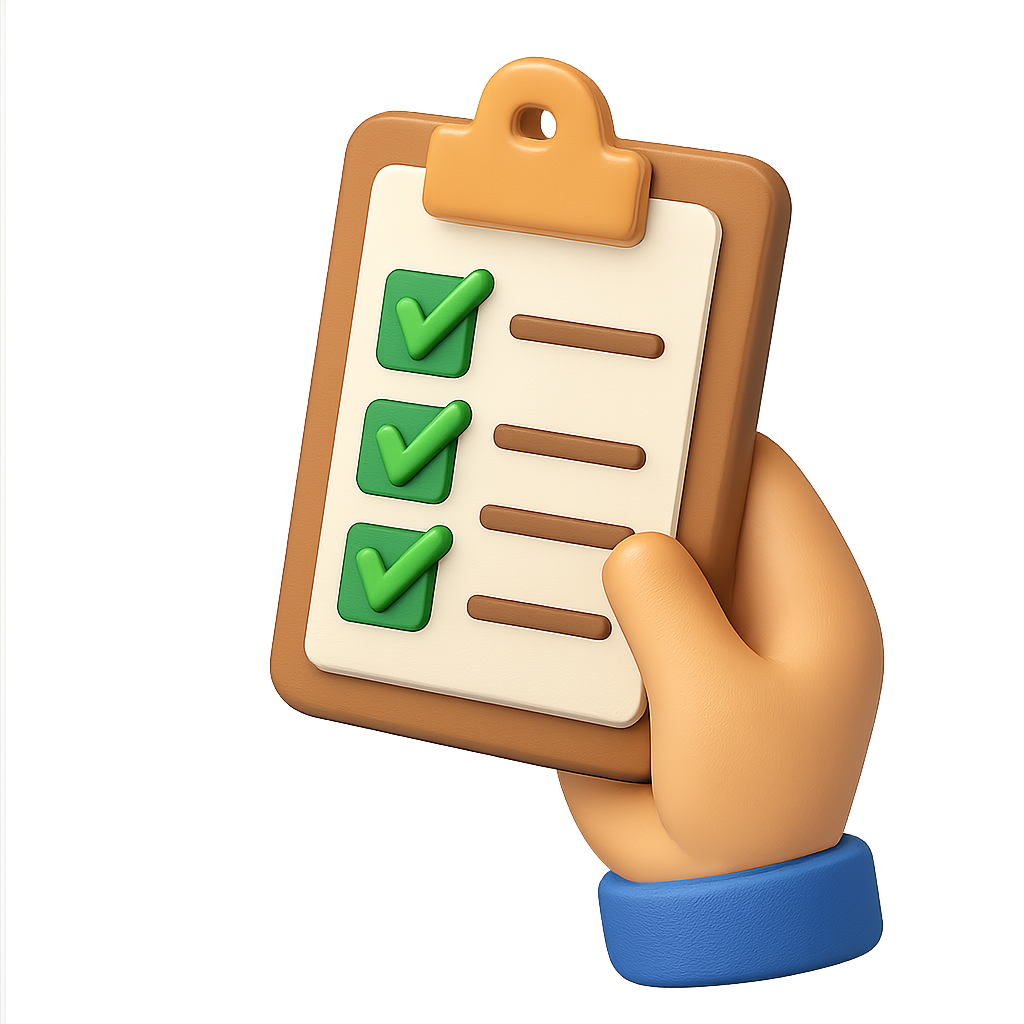 A 3D rendered icon featuring a hand holding a checklist with green checkmarks. The design has a transparent background and showcases a modern isometric style.