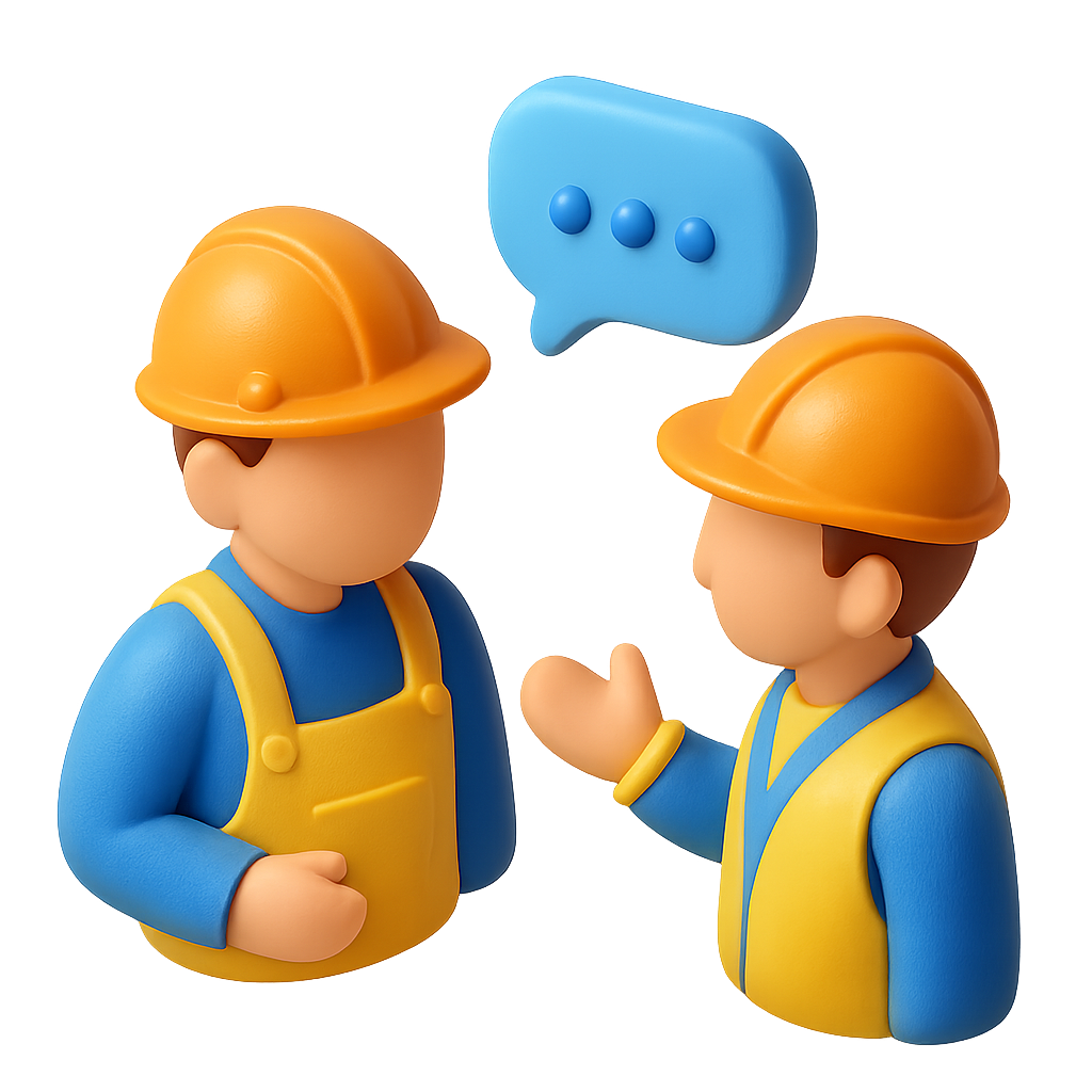 A vibrant 3D icon depicting two construction workers in conversation. Both wear hard hats and overalls, with a speech bubble above them, creating a lively, isometric feel.