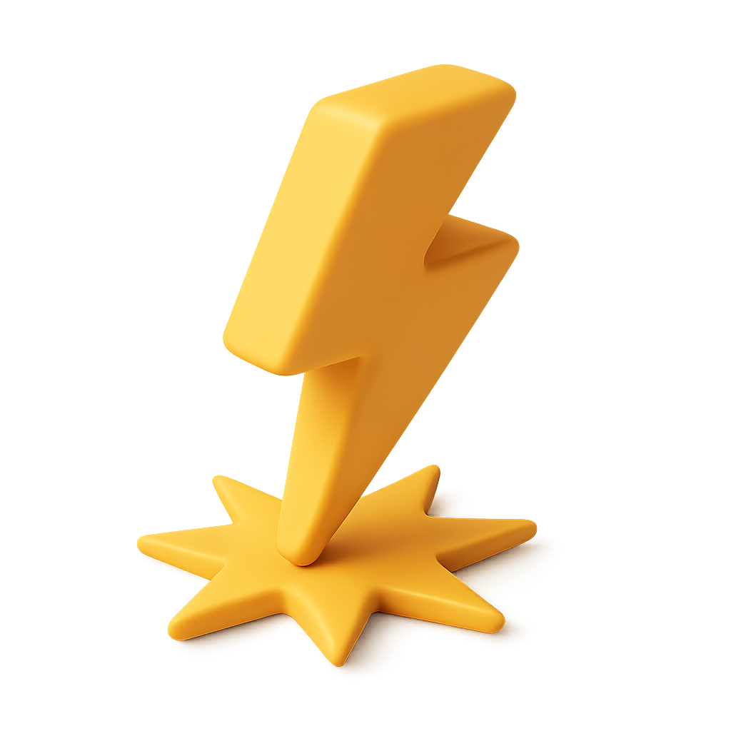 A vibrant yellow lightning bolt icon stands upright, striking a star-shaped base. The design features a smooth, glossy finish, set against a soft gradient background, enhancing its 3D appearance.