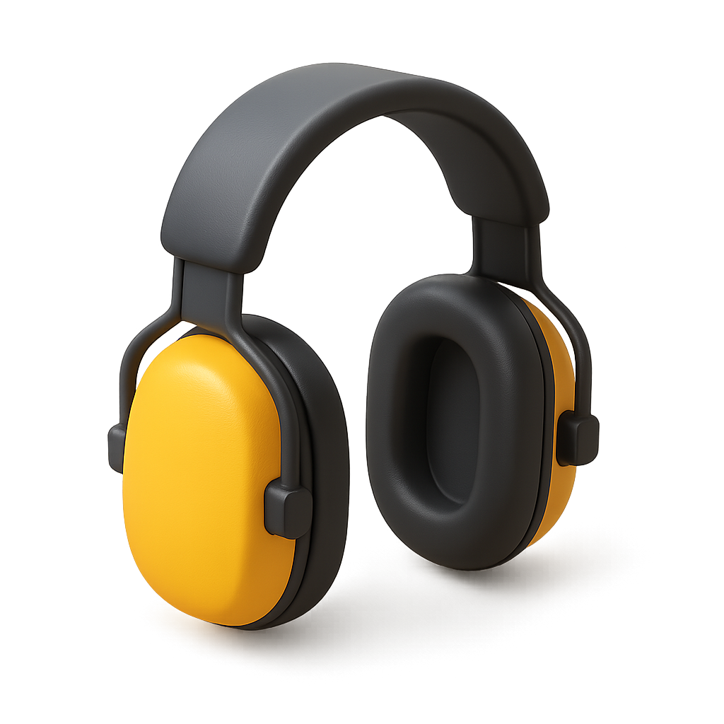 This image features a sleek 3D icon of ear muffs designed for noise reduction. It showcases a three-quarter view with a modern black and yellow color scheme, set against a gradient background.