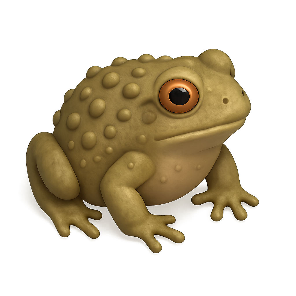A detailed 3D depiction of a toad featuring warty skin, presented in a three-quarter isometric view. The character exhibits a volumetric design with a transparent background.