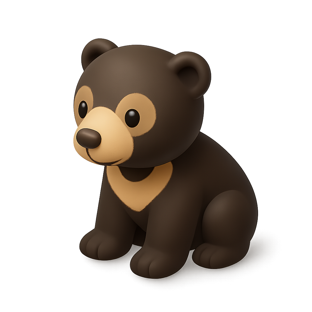 A stylized 3D icon of a sun bear, featuring a cute expression and a volumetric design. The bear is depicted from a three-quarter view with a smooth finish on a transparent background.