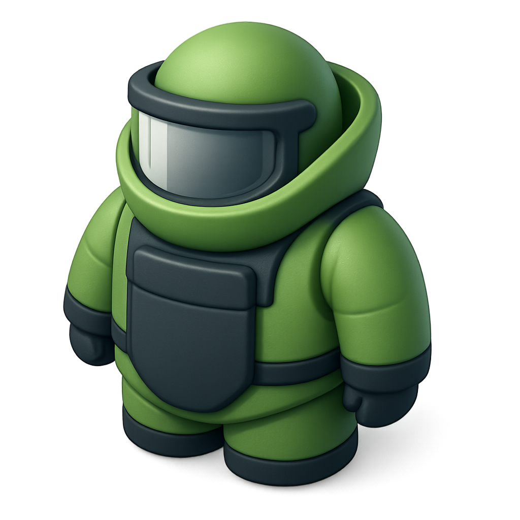 A stylized 3D icon of a bomb suit in green, featuring a rounded design and a three-quarter view, set against a soft gradient background for depth.