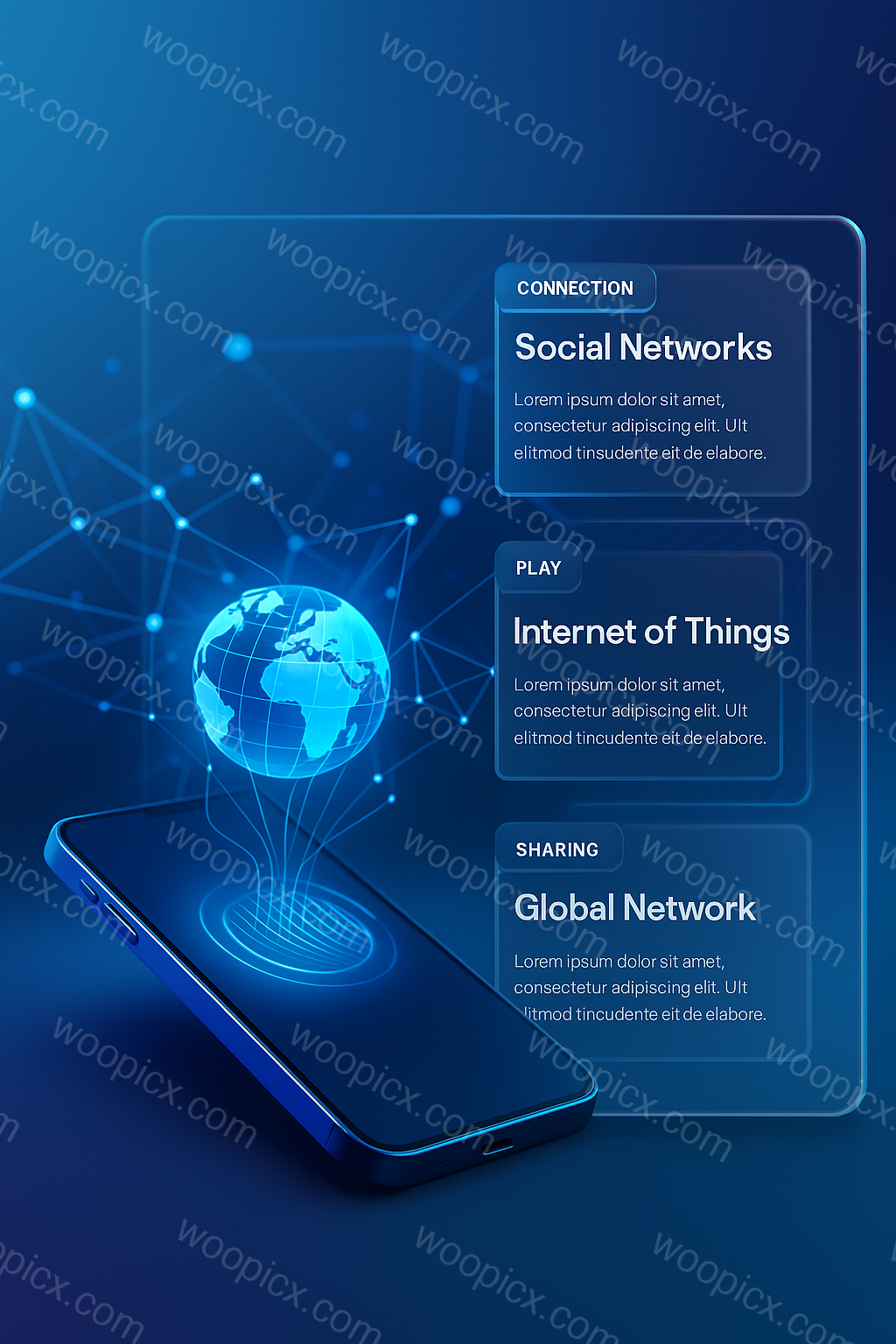 /Premium/Collection: /by davooda/Type: PNG/A sleek 3D illustration showcasing a smartphone connected to social networks and the Internet of Things. Features a transparent background with gradient layers and text blocks highlighting connectivity.