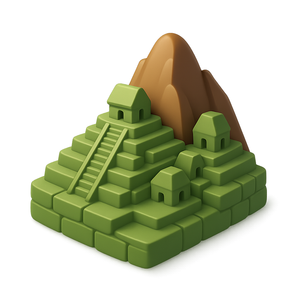 /Collection: /by davooda/Type: PNG/A stylized 3D icon of Machu Picchu featuring green stone structures and a brown mountain backdrop. The design is isometric and has a volumetric appearance, emphasizing depth.