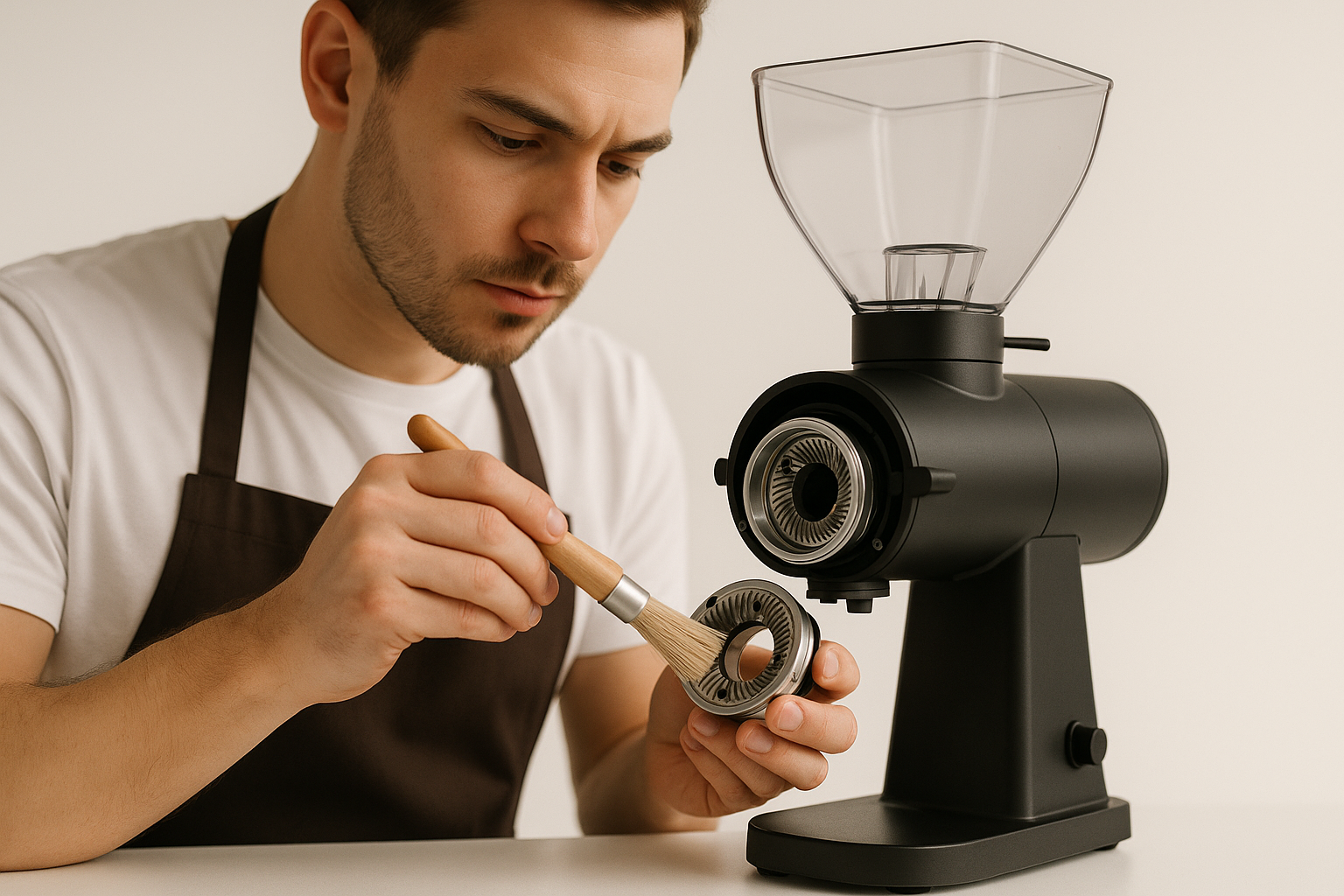 Barista Cleaning a Modern Coffee Grinder in Minimalist Style