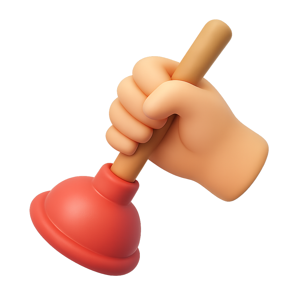 A stylized 3D icon featuring a hand gripping a red plunger. The image showcases a three-quarter view with a smooth, volumetric design on a transparent background.