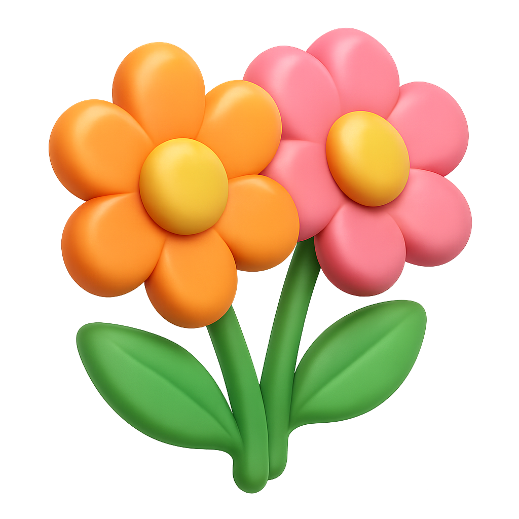 Two vibrant, stylized flowers in a three-quarter isometric view, featuring bright orange and pink petals with yellow centers, set against a soft gradient background.