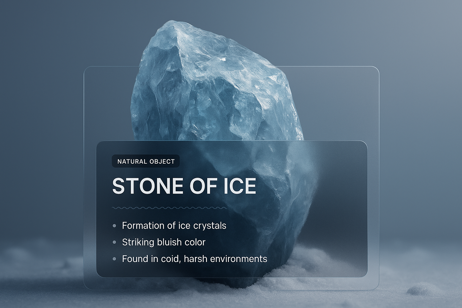 /Collection: /by davooda/Type: PNG/A visually striking 3D representation of a stone of ice, featuring a transparent overlay with text detailing its characteristics and natural environment, set against a smooth gradient background.