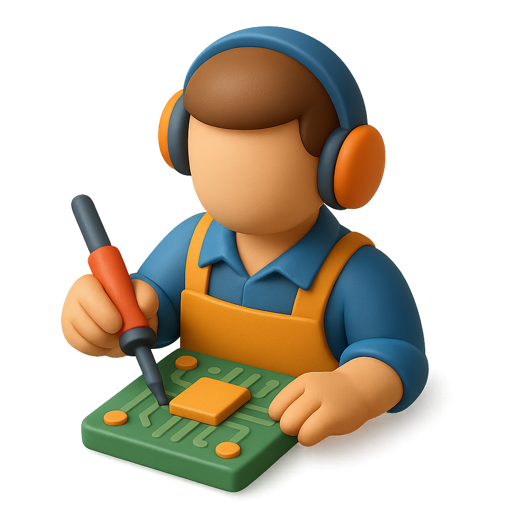 /Collection: /by davooda/Type: PNG/A stylized 3D icon depicting an electronics repair specialist working on a circuit board, featuring a colorful design with headphones and a soldering tool.