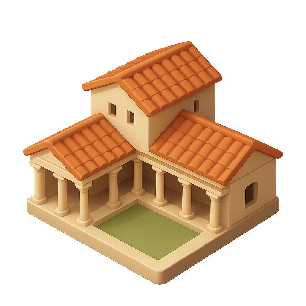 /Collection: /by davooda/Type: PNG/A stylized 3D icon of a Roman villa estate showcasing a classic architectural design with a sloped roof, columns, and a central courtyard, presented in a three-quarter isometric view.