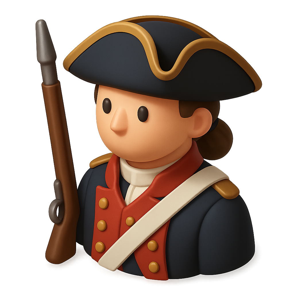 /Collection: /by davooda/Type: PNG/A charming 3D icon of a Continental American soldier, featuring a historical uniform and a musket. The character is presented in a three-quarter view with a smooth, volumetric design on a transparent background.