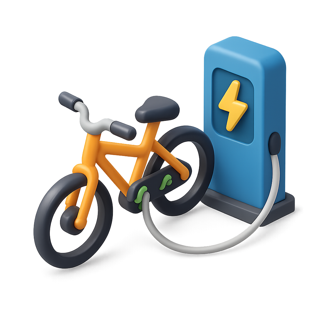 /Collection: /by davooda/Type: PNG/A vibrant 3D illustration of an electric bicycle connected to a charging station. The bike features a sleek design with bright colors, showcasing a charging cable.