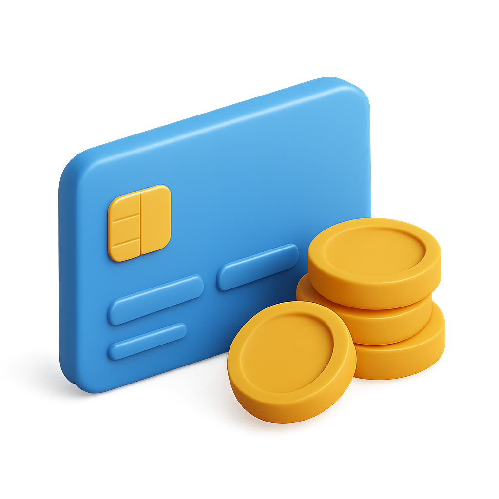 A vibrant 3D representation of a blue credit card alongside three yellow coins, designed in a three-quarter view with a transparent background, showcasing an isometric and volumetric style.