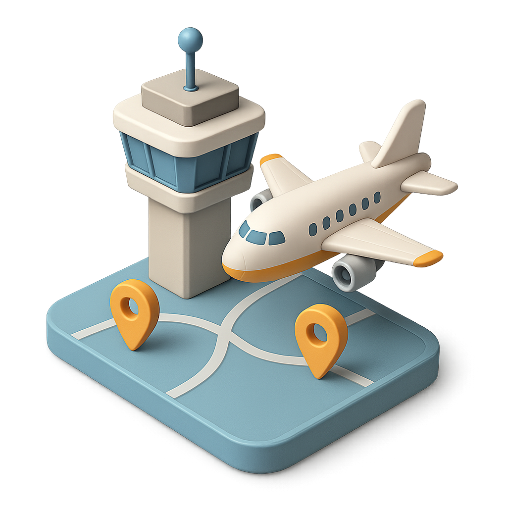 A vibrant 3D illustration featuring an air traffic control tower and a small airplane on a stylized map base with location markers, showcasing a modern design.