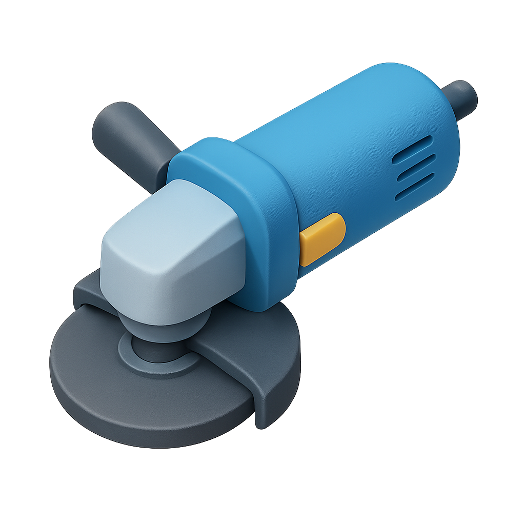 This image features a sleek 3D icon of a grinder with a wheel, designed in a three-quarter view. The bright blue and gray colors give it a modern look, set against a dark background.