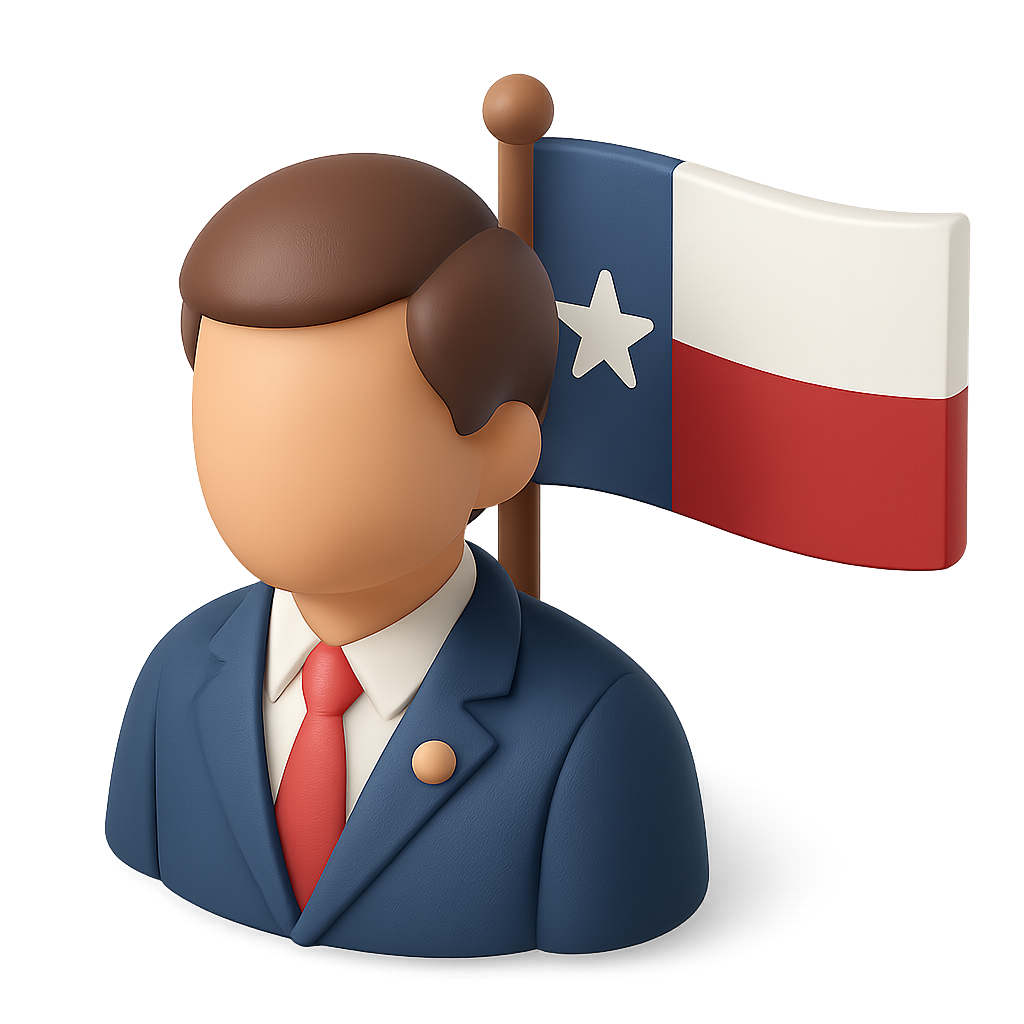 /Collection: /by davooda/Type: PNG/A stylized 3D icon of a governor figure in a suit, featuring a Texas state flag. The icon is designed from a three-quarter perspective with a transparent background.