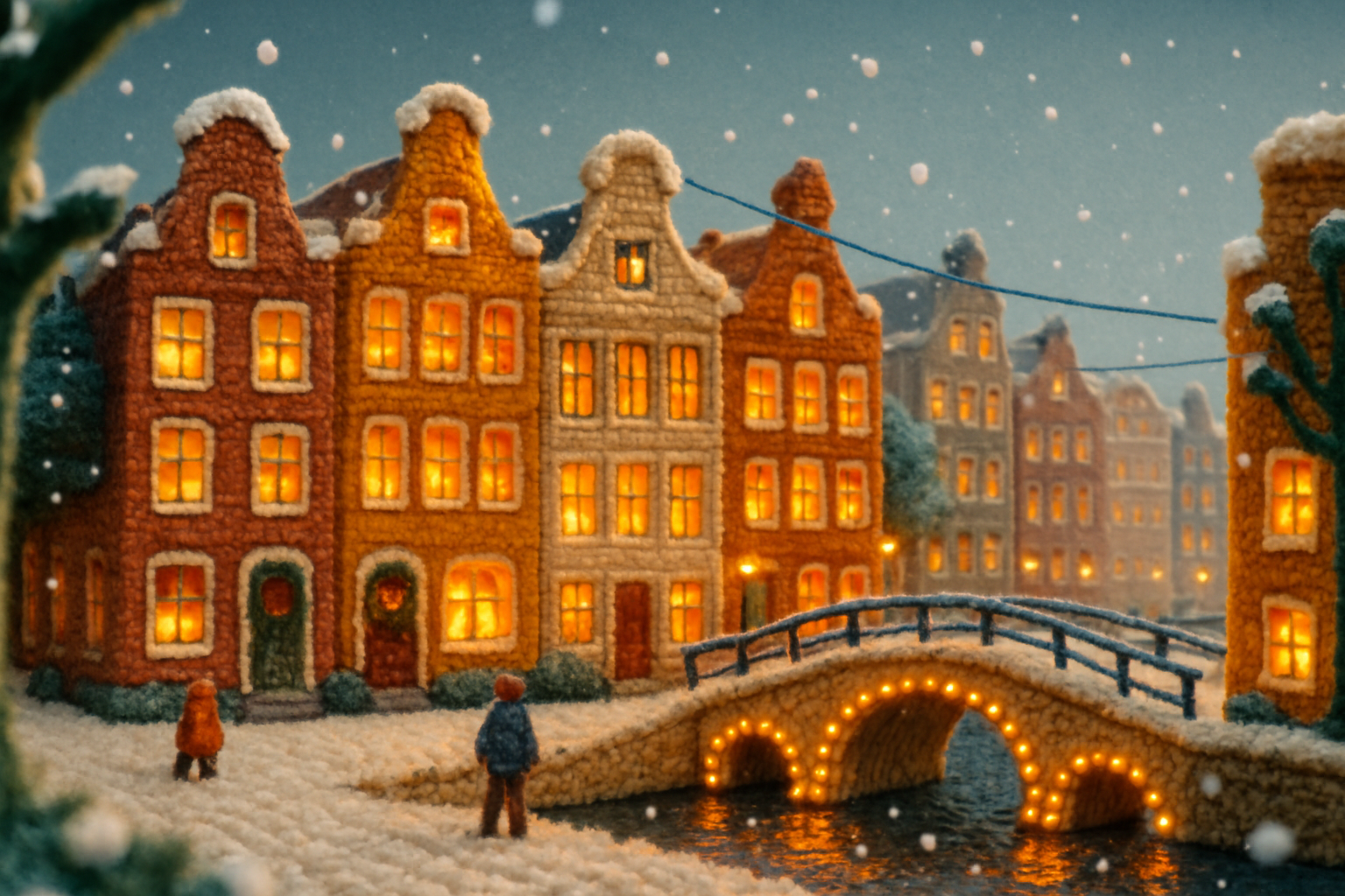 /Collection: /by davooda/Type: PNG/A whimsical winter scene depicting Amsterdam's architecture crafted from wool. The scene features glowing windows, gentle snowfall, and small figures, all creating a festive atmosphere.