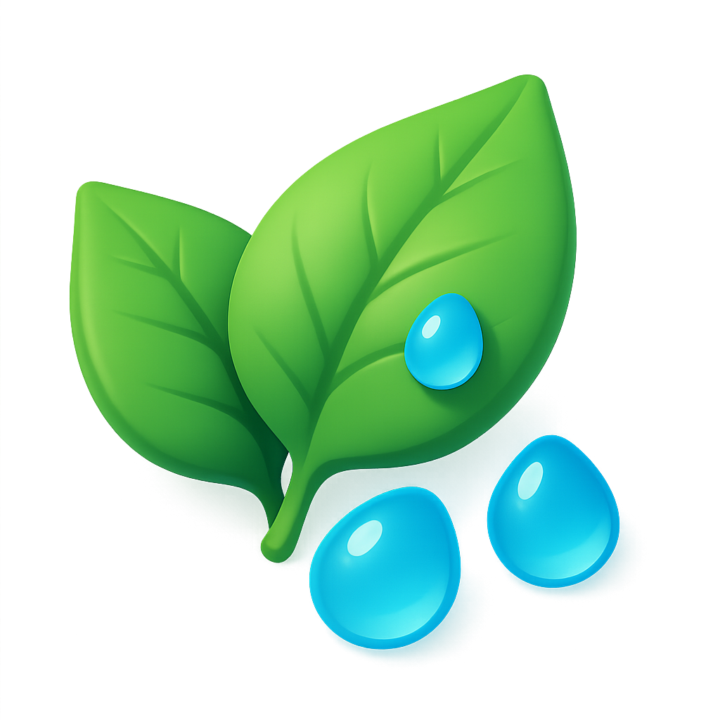 A vibrant 3D representation of green leaves adorned with glossy water droplets, showcasing a three-quarter isometric view with a smooth, volumetric design.