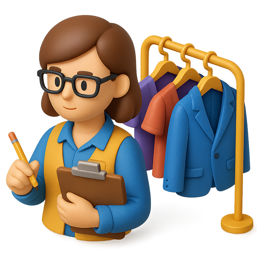 /Collection: /by davooda/Type: PNG/A 3D icon depicting a wardrobe supervisor holding a clipboard and pencil, surrounded by colorful costumes on a rack. The design has a transparent background and an isometric view.