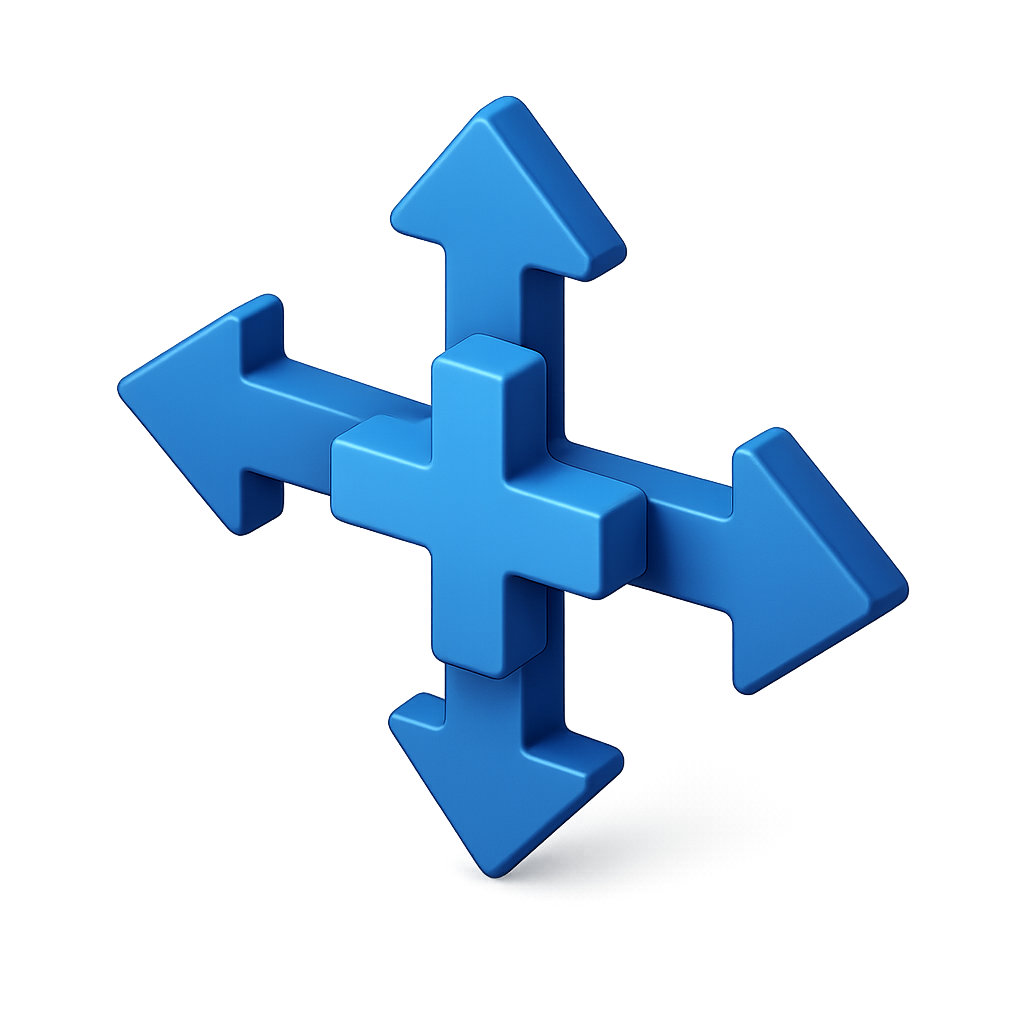 A vibrant 3D icon featuring multiple directional arrows arranged in a cross pattern. The arrows are glossy and volumetric, set against a subtle gray background.