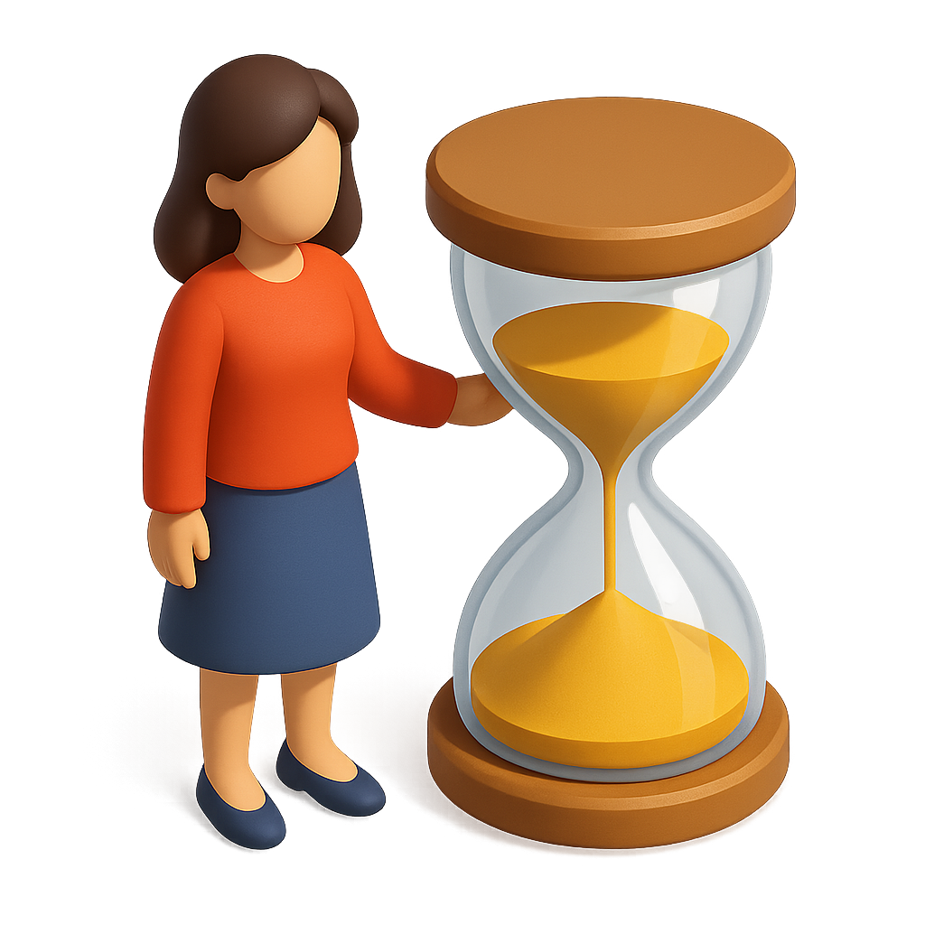 /Collection: /by davooda/Type: PNG/A stylized 3D icon depicting a woman standing beside a large hourglass, showcasing a vibrant color palette and a volumetric design. The scene emphasizes a modern, simplistic aesthetic.