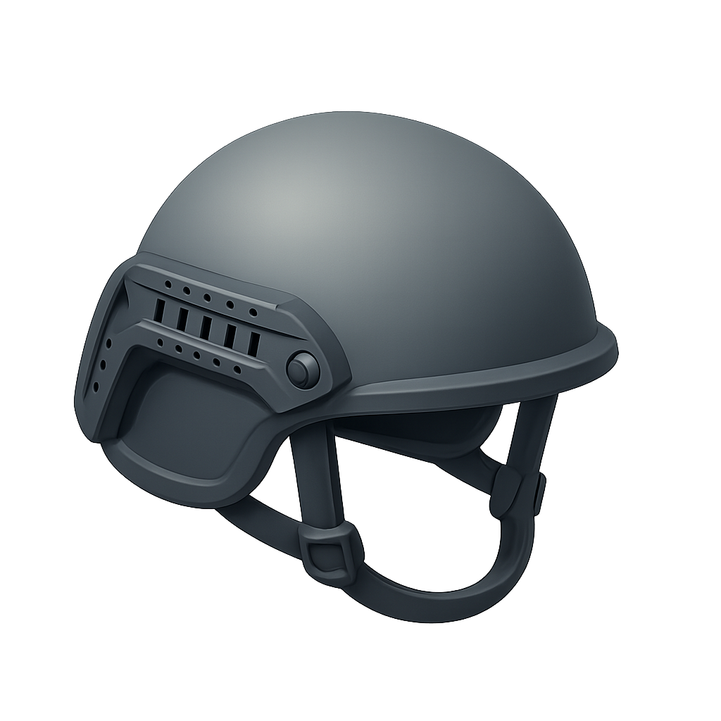 A modern ballistic helmet illustrated in a three-quarter isometric view. The design features a smooth surface with ventilation slots and an adjustable strap, set against a dark gradient background.