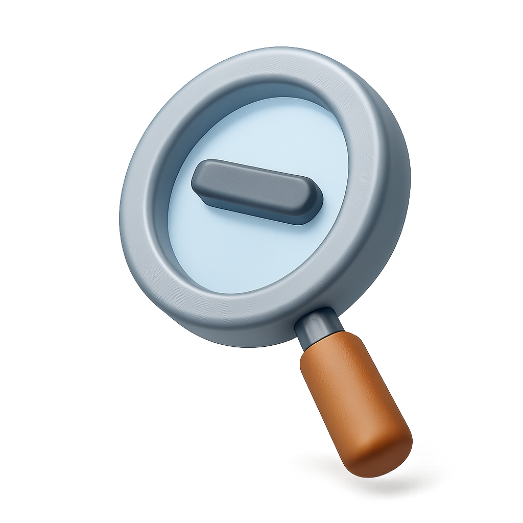 A three-dimensional illustration of a magnifying glass featuring a minus sign in its center. The design showcases a sleek, volumetric style with a transparent background and a three-quarter perspective.