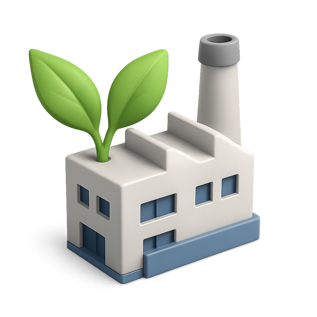 Stylized Eco-Friendly Factory Icon with Green Leaves