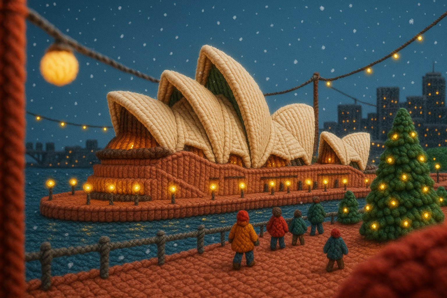 /Collection: /by davooda/Type: PNG/A magical 3D depiction of the Sydney Opera House crafted from thick yarn, featuring a snowy atmosphere with colorful lights, tiny figures, and a cozy holiday vibe.