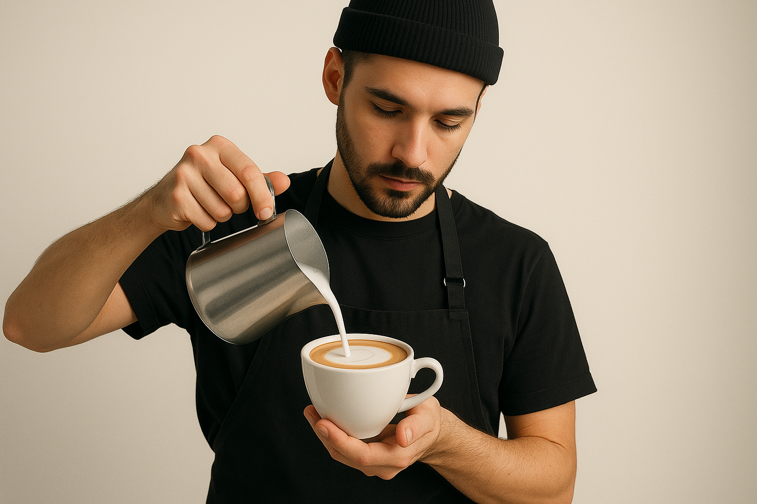 A modern barista skillfully pours steamed milk into a cappuccino cup, showcasing minimalist style and coffee artistry.