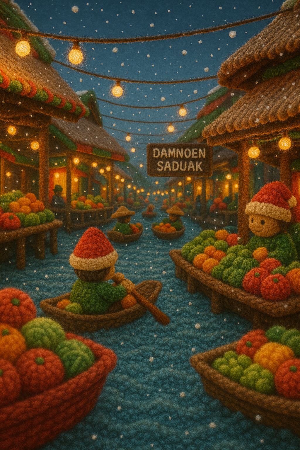 /Collection: /by davooda/Type: PNG/A vibrant and whimsical market scene crafted from wool, depicting small figures in Santa hats amidst colorful fruit stalls. The atmosphere is festive, with soft snowfall and glowing lights.