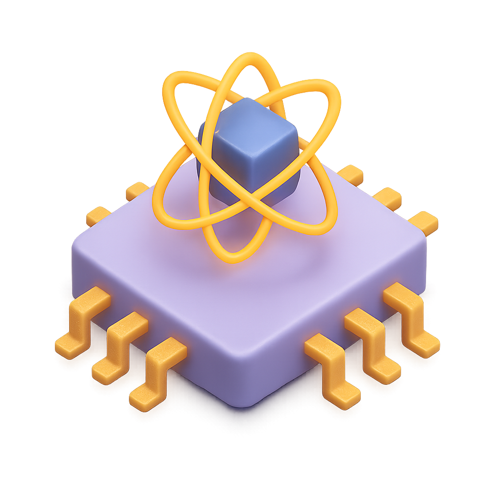 This image features a stylized 3D quantum chip with an atom symbol above it, set against a gradient background. The chip has a purple base with yellow and blue elements, showcasing a futuristic design.