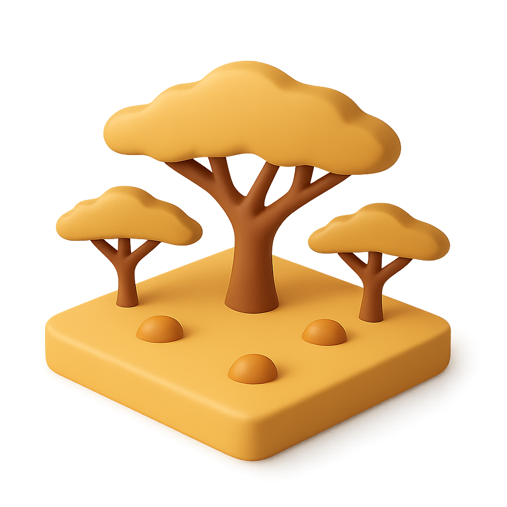 A vibrant 3D icon depicting a savanna landscape with stylized trees and a textured ground. The design features a yellow color scheme, enhancing its volumetric appearance.