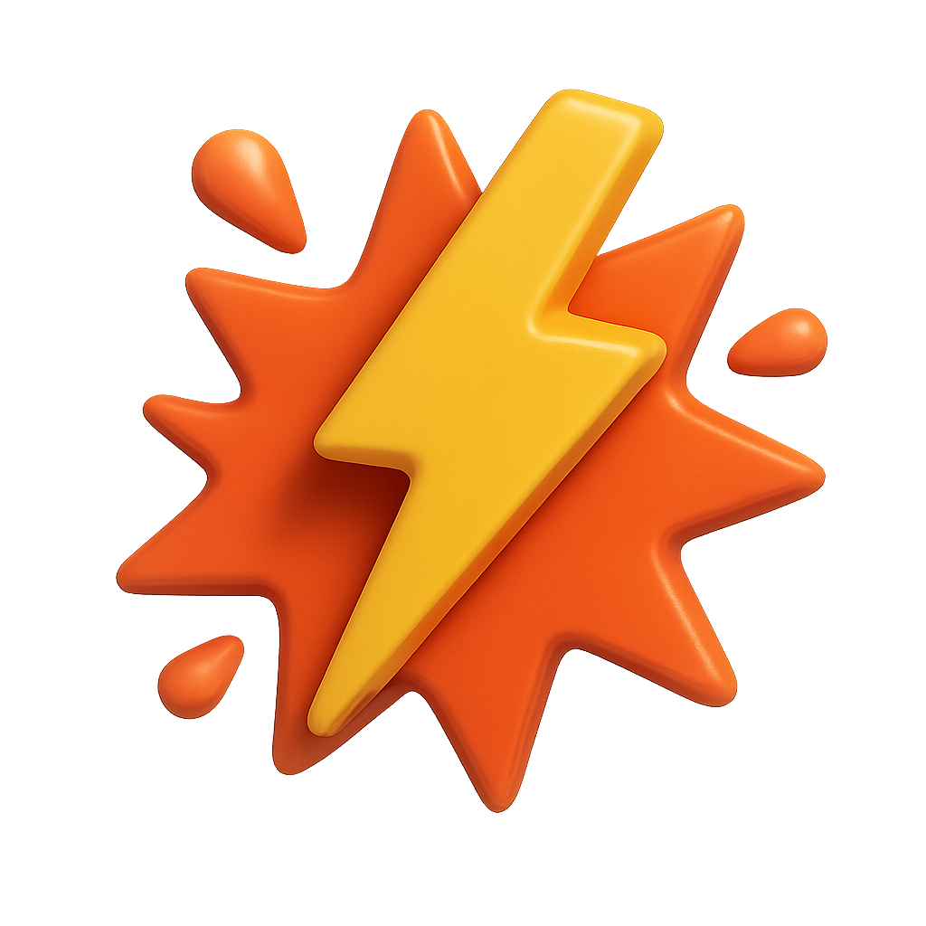 A vibrant 3D icon featuring a yellow lightning bolt set against an explosive orange background, designed in an isometric style with a transparent backdrop.
