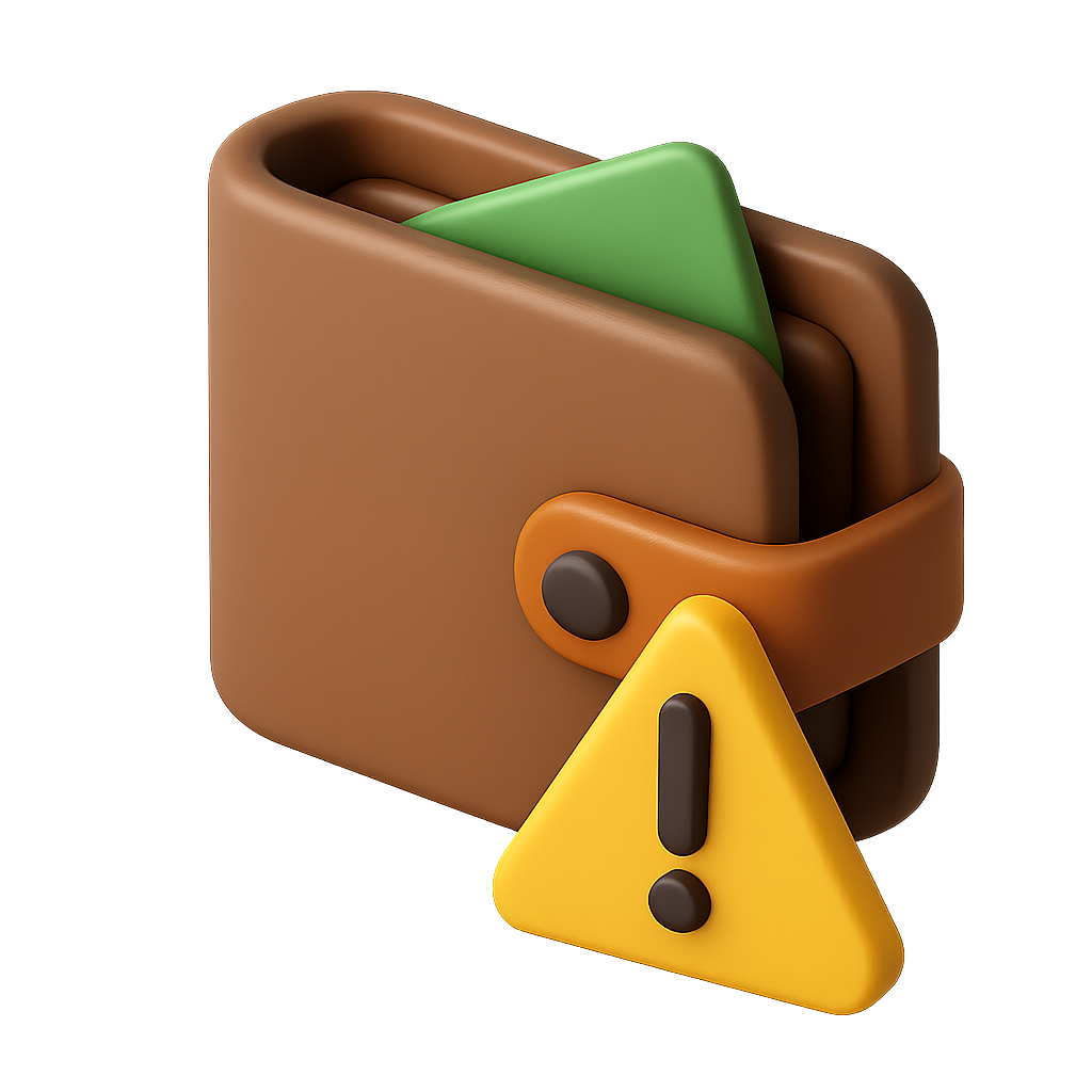 A 3D illustration of a wallet featuring a warning sign, showcasing a modern design. The wallet is brown with green cards peeking out, emphasizing alertness.
