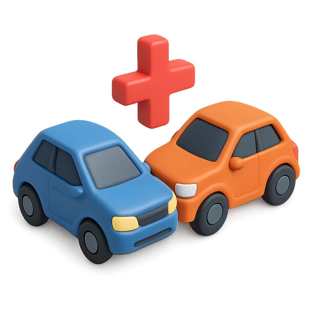/Collection: /by davooda/Type: PNG/A vibrant 3D illustration featuring two cartoonish cars, one blue and one orange, positioned facing each other against a blurred background. A red plus symbol hovers above them, adding a playful element to the scene.