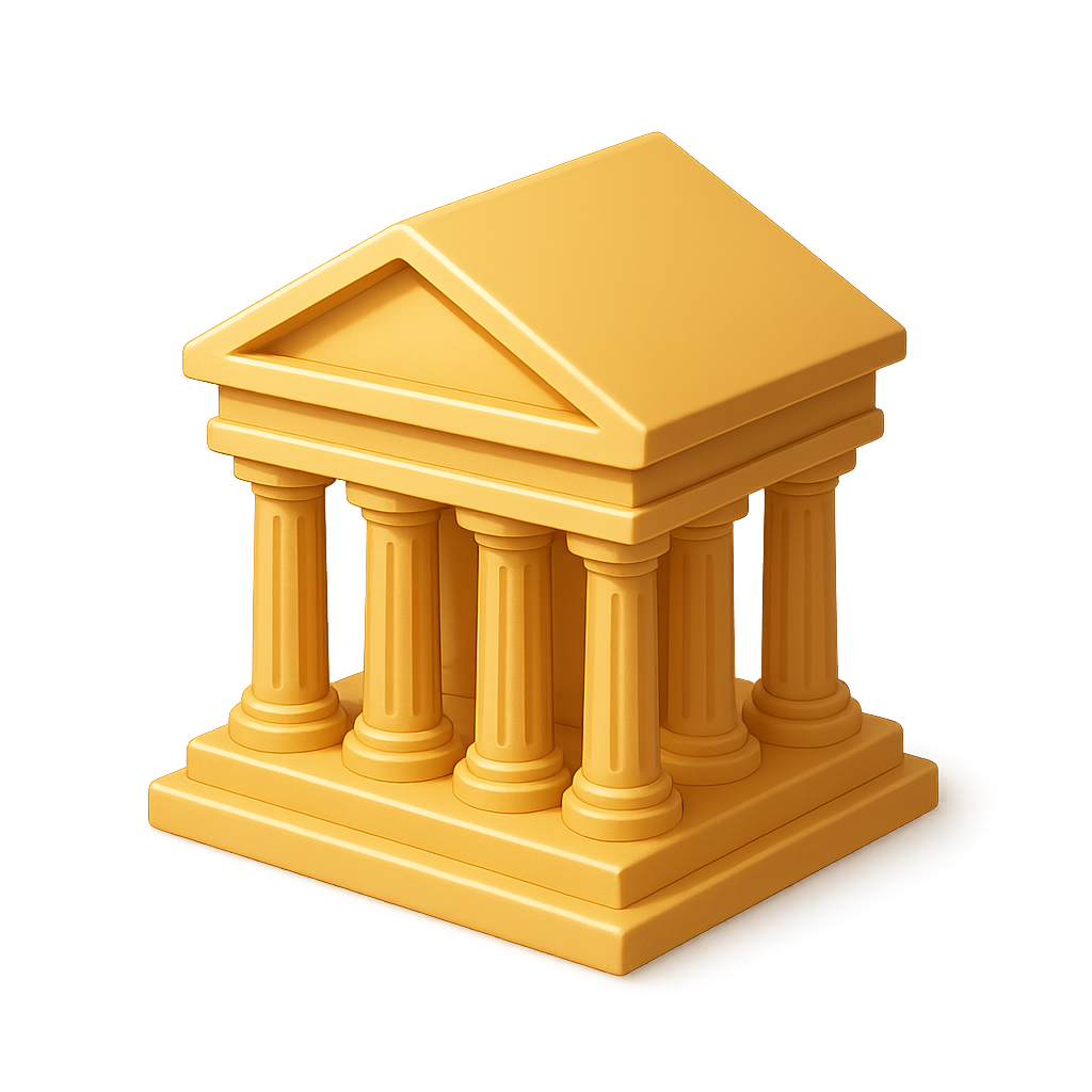 /Collection: /by davooda/Type: PNG/This 3D icon represents a classic Greek temple with a golden hue, featuring prominent columns and a triangular roof. It is designed in a three-quarter view with a volumetric appearance against a softly lit background.