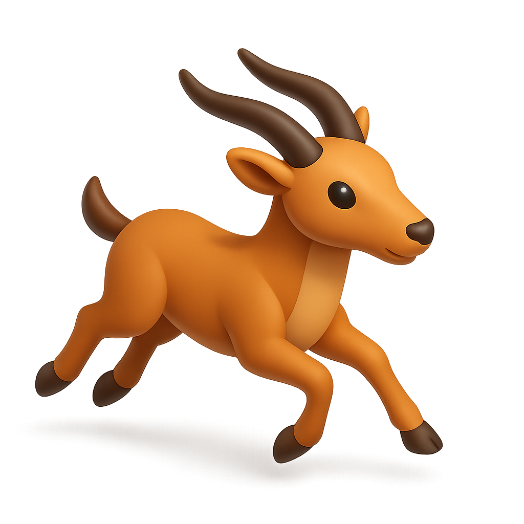 A stylized 3D antelope icon depicted in a lively pose, running energetically. The design features a smooth, rounded body with prominent antlers, set against a soft gradient background.